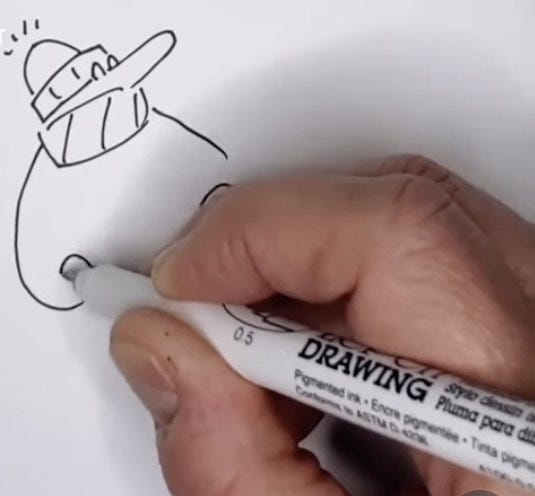 This morning, I happened upon an Instagram video of my New Yorker colleague, Chris Weyant drawing. Even though I spend most of my work day watching drawings of my own appear on paper, I found myself in a kind of drifty zone (no snow punning intended) seeing Chris’s pen move efficiently along the page, creating a great little fellow all bundled up. I think it brought me back to childhood memories of watching Jon Nagy’s Learn To Draw television show. There’s a kind of magic when drawings develop on a blank page.